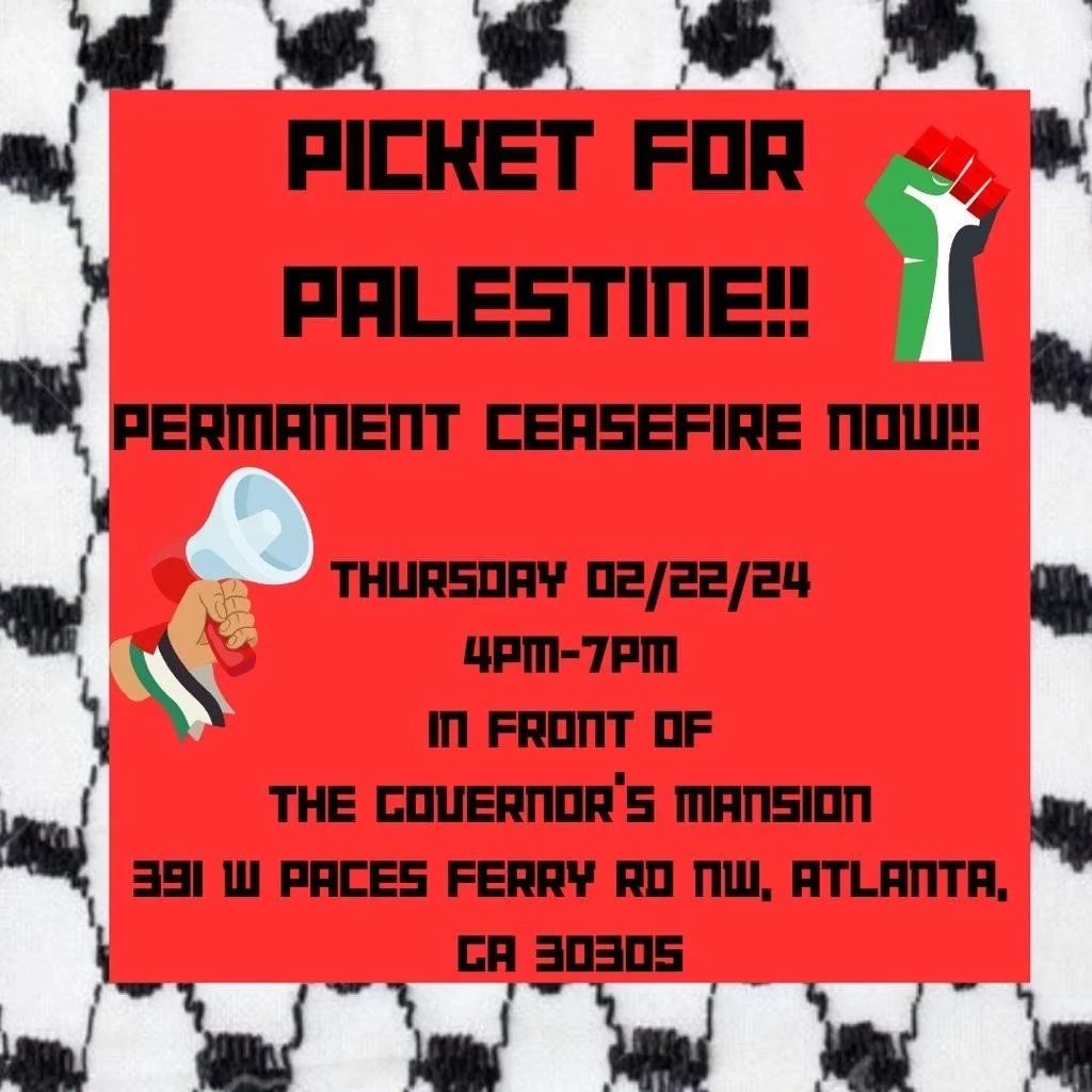On Thursday, Feb 22, join us for a picket from 4 PM-7PM in front of the mansion of Georgia Governor and supporter of apartheid Israel, Brian Kemp!