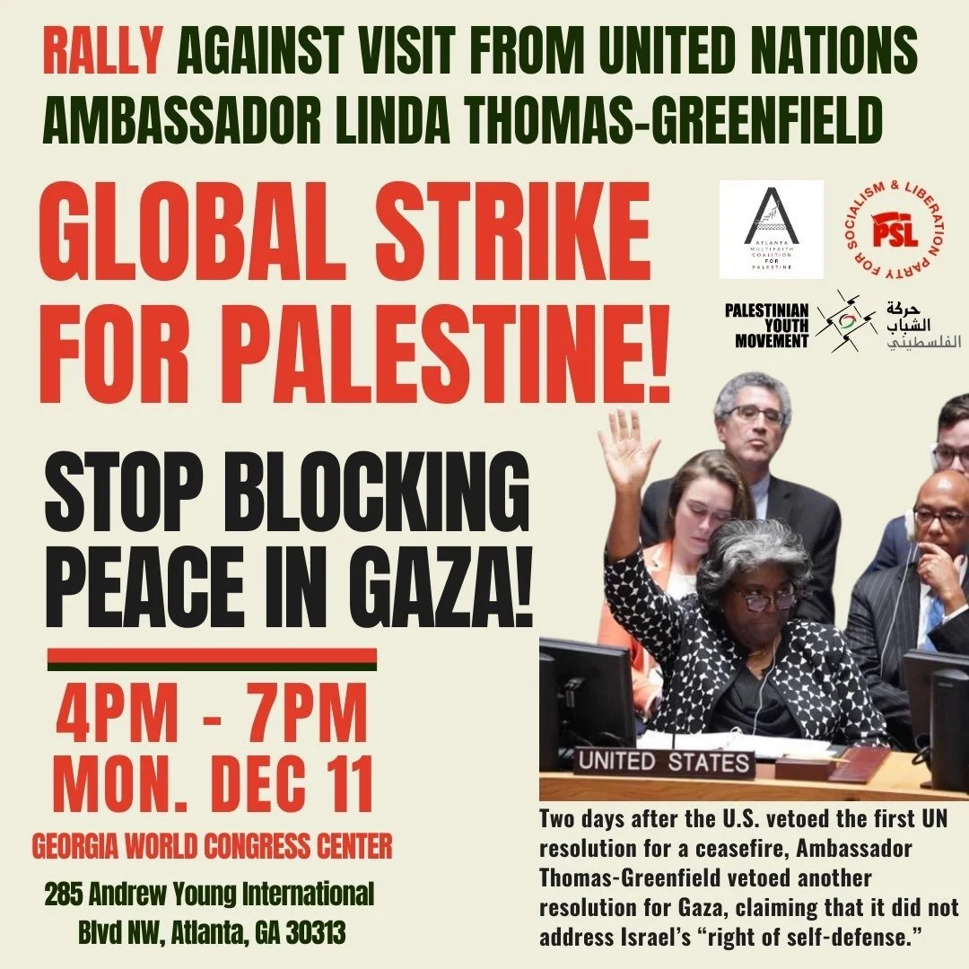 Tomorrow, we will gather outside the Georgia World Congress Center 4-7PM in protest of Linda Thomas-Greenfield’s visit to Atlanta. She is the U.S. ambassador to the United Nations who vetoed a UN resolution for Gaza in October in defense of apartheid Israel. We charge Thomas-Greenfield with genocide!